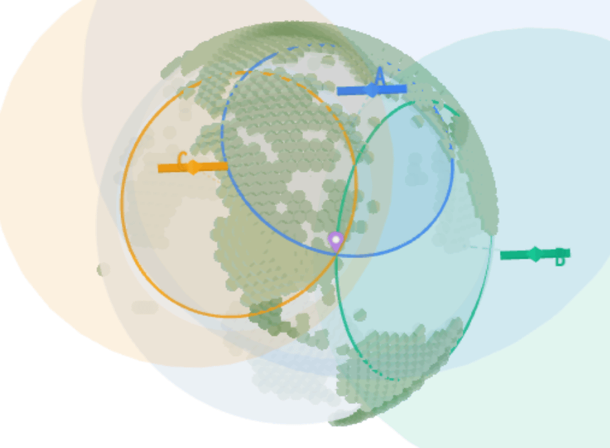 ここに2機目の衛星を加えると候補は2点まで減り、3機目を加えるとそのうち1点に定まります。これが三点測量と呼ばれる仕組みです。