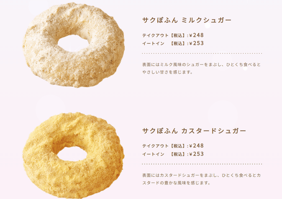 サクぽふんはミルクシュガーとカスタードシュガーの2種類登場します。どちらもテイクアウトなら税込248円、イートインなら税込253円。