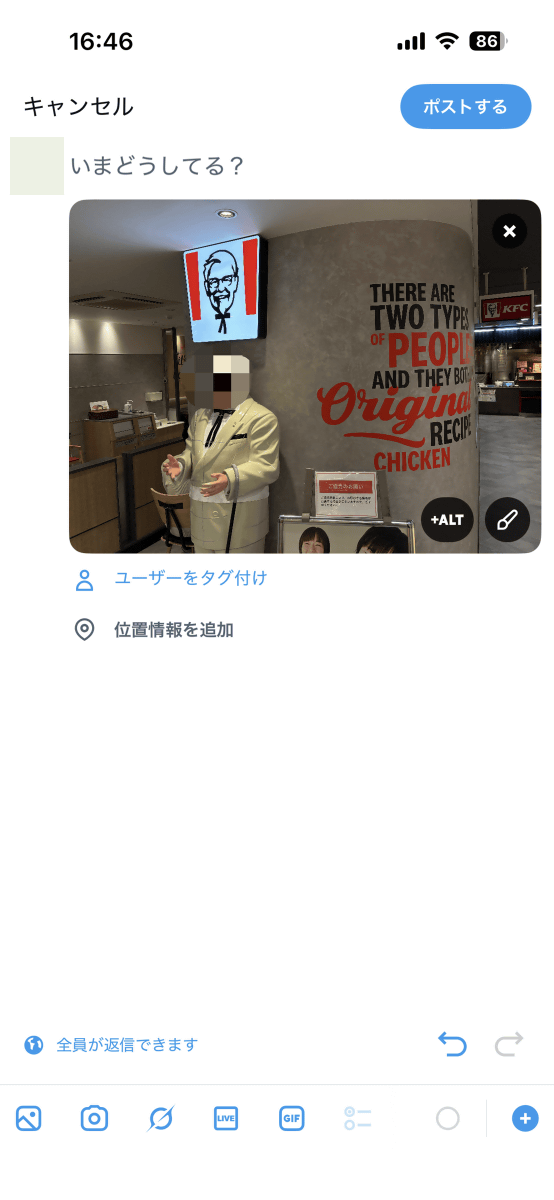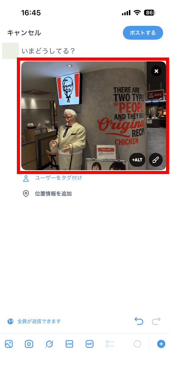 Grokによる編集も可能とのですが、Xの無料プランでは編集ボタンが表示されませんでした。