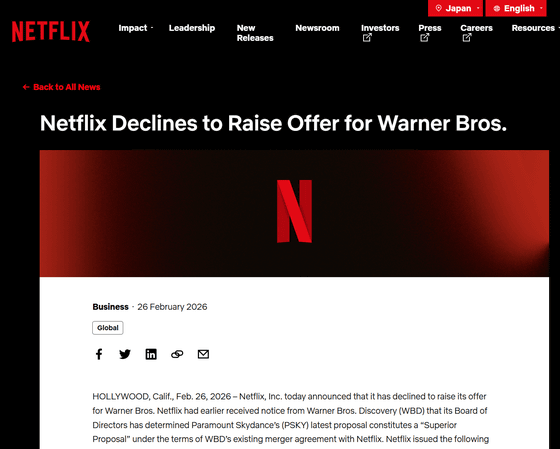 その後もNetflixとパラマウント・スカイダンスは買収提案を改善しており、Netflixは最終的に830億ドル(約12兆9000億円)での買収提案を行っていました。しかし、現地時間の2026年2月26日にNetflixはこの買収契約を撤回すると発表しています。Netflixの共同CEOであるテッド・サランドス氏とグレッグ・ピーターズ氏は、パラマウント・スカイダンスによる新たな買収提案を受け、「同額のオファーを拒否する」と説明しました。