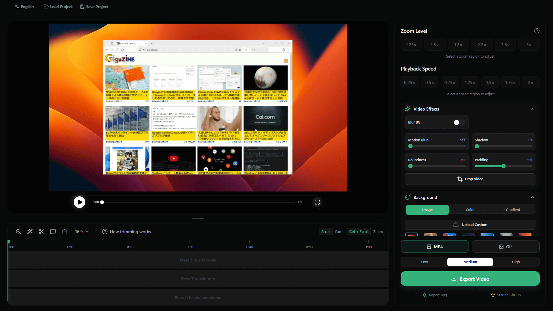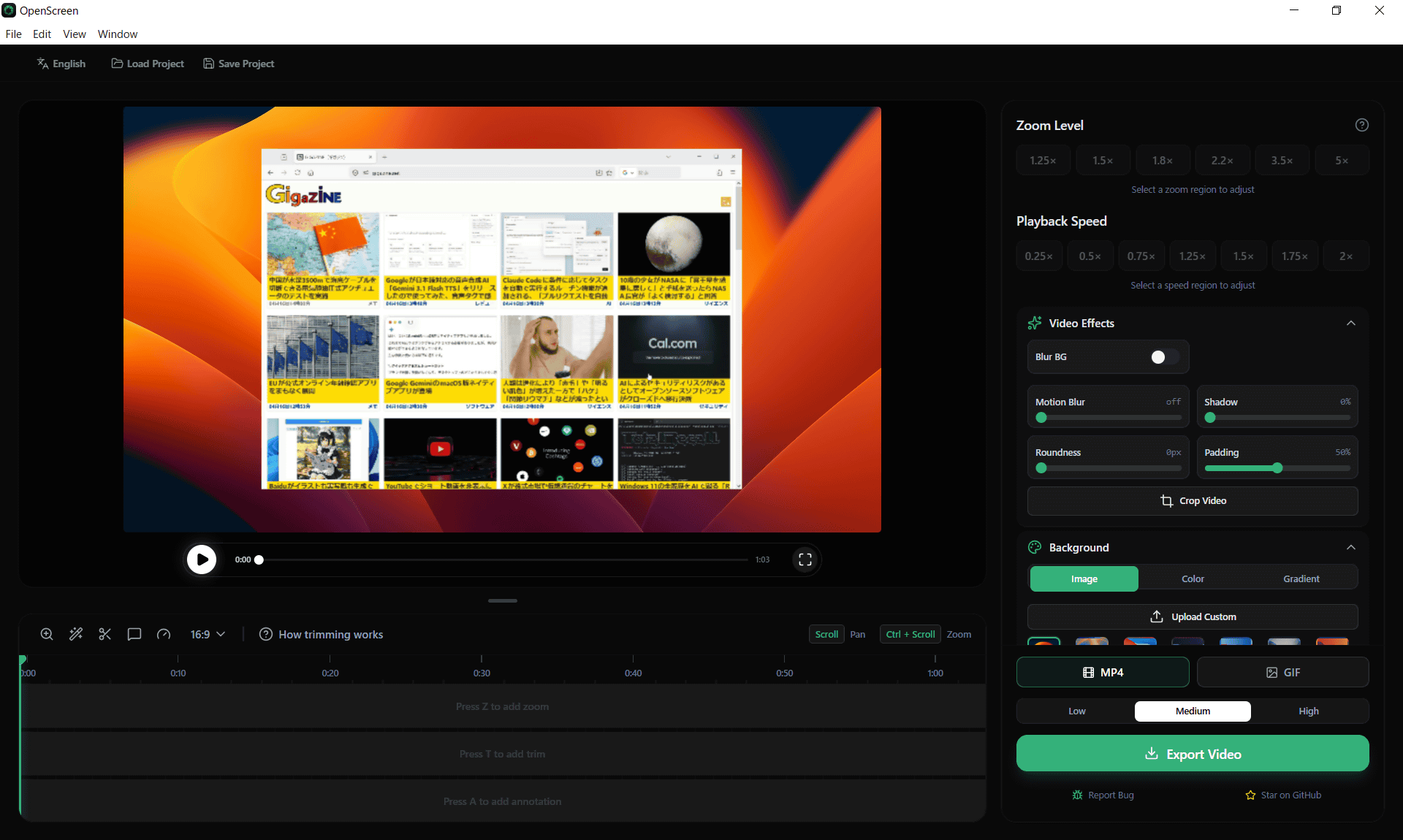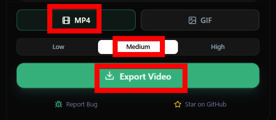 Open ScreenではMP4形式あるいはGIF形式で書き出すことが可能。画質はLow・Medium・Highの3段階で、「Export Video」をクリックすればOK。細かい設定は必要ないので、初心者でも安心して使うことができます。