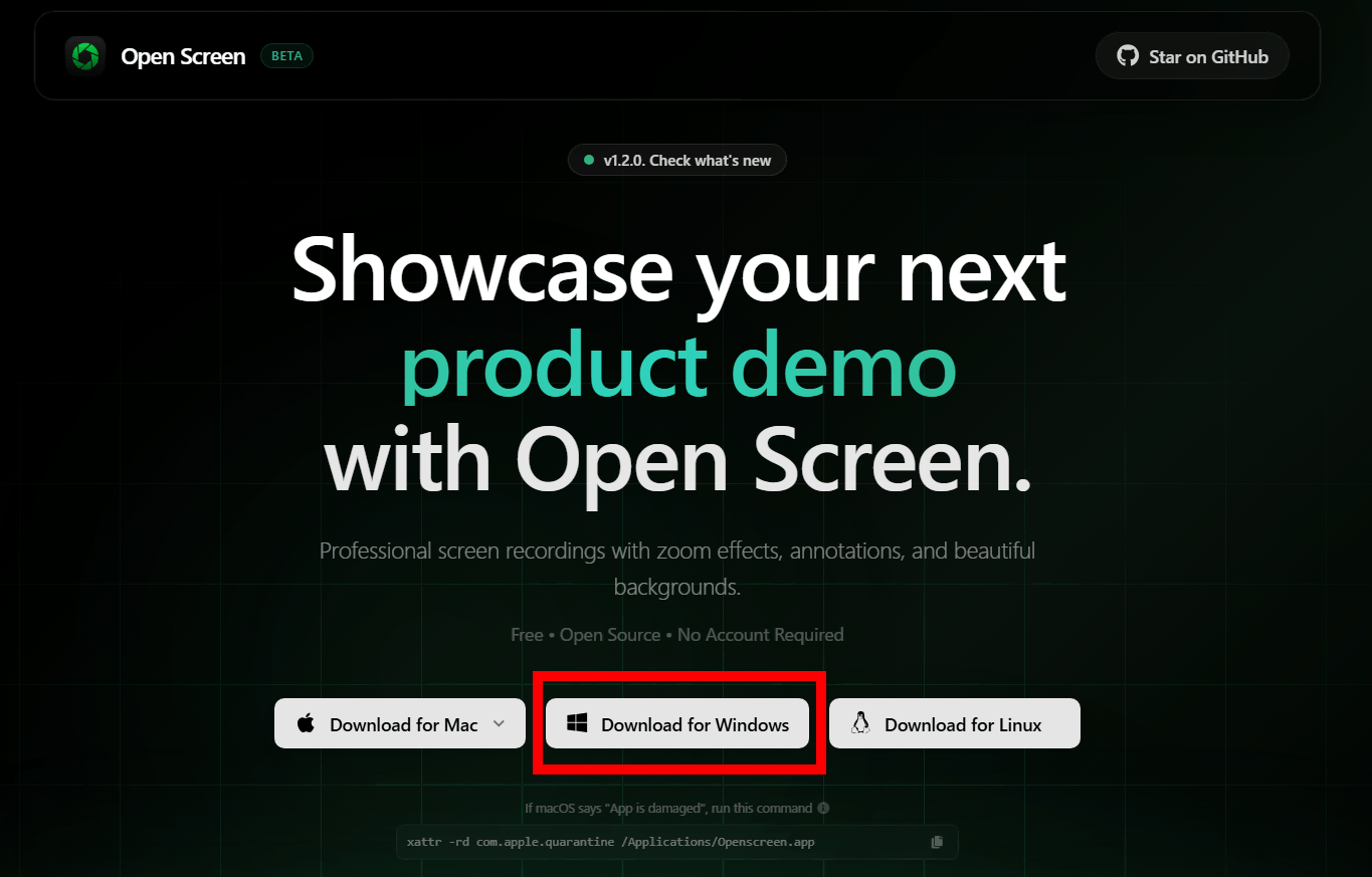 「Open Screen」は画面収録から簡単な編集、書き出しまでをまとめて行えるデモ動画作成ツールです。Screen Studioの無料かつオープンソースな代替として位置付けられており、サブスクリプションなし・透かしなし・商用利用可能なのが特徴。製品デモや操作解説動画を手軽に作るための基本機能を重視した、よりシンプルなアプリとなっています。