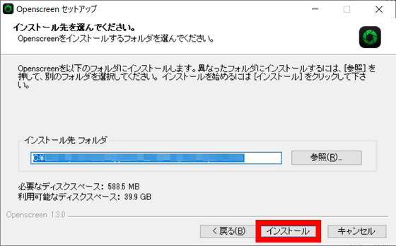 インストール先を確認したら「インストール」をクリック。