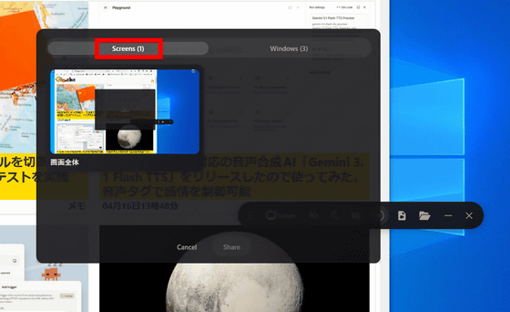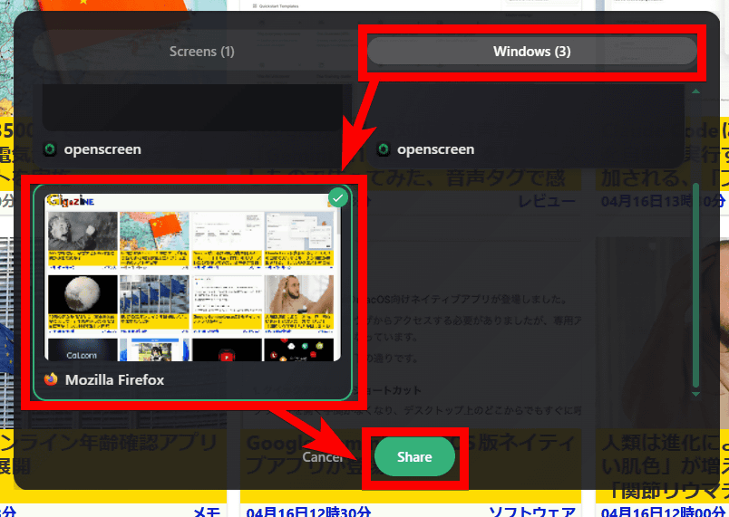 「Windows」で、ウィンドウ単位で収録画面を選択できます。今回はFirefoxの画面を収録するため、「Mozilla Firefox」を選択し、「Share」をクリック。