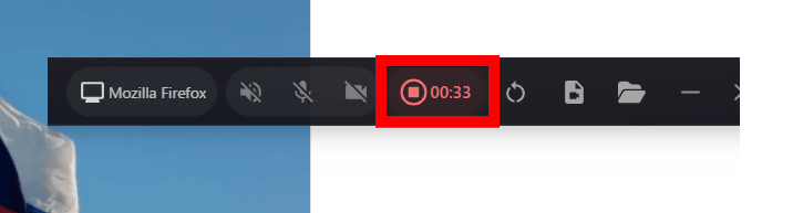 収録する画面を選択したら、録画ボタンをクリックすれば収録がスタートされます。なお、録画ボタンの左にあるスピーカーアイコン・マイクアイコン・カメラアイコンをアクティブにすると、それぞれ音声収録、外部マイク収録、外部カメラ収録を有効化できます。今回はすべて無効のまま収録しました。
