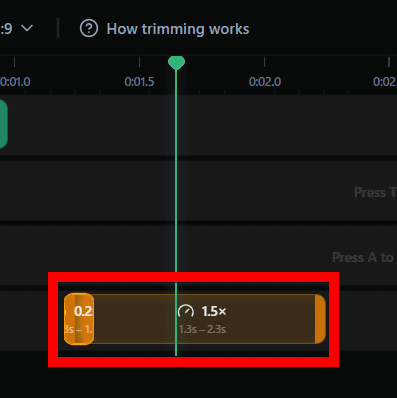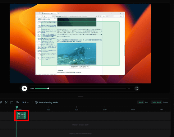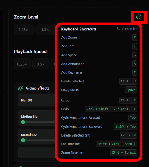 編集は基本的にタイムライン上にズームや速度変更、文字入力などをショートカットで配置していく流れ。ショートカット一覧は右上の「?」アイコンにカーソルを重ねると表示されます。