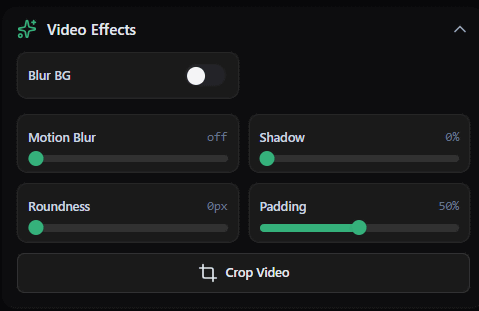 画面右の編集メニューからは、映像に重ねる効果や映像のクロップを変更可能。