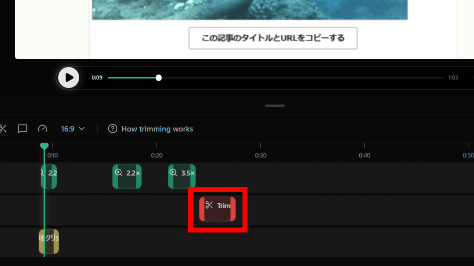 動画の中で不要な部分はTキーを入力して「トリミング」を設定。書き出しの際に、トリミング指定した部分の動画が除去されます。