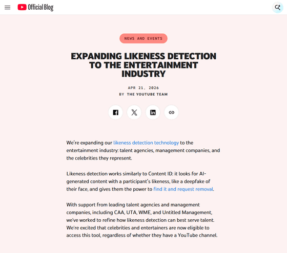 YouTubeは2024年から類似性検出技術のテストを行ってきました。当初はYouTube上で人気のクリエイター向けに提供されていましたが、2026年初頭には一部の政治家や公務員向けに利用範囲を拡大。そして今回、利用範囲はエンターテインメント業界全体にまで拡大したこととなります。
