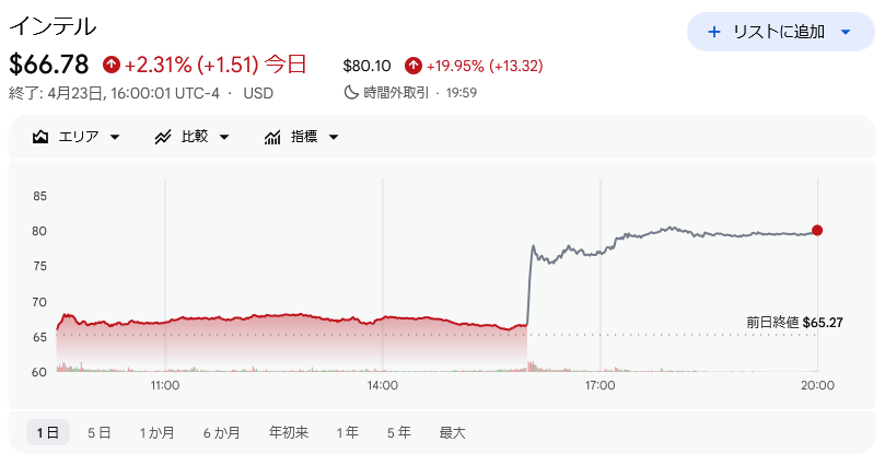 なお、Intelの株価は決算報告の後、時間外取引によって前日比19.95%の増加を記録しています。