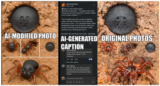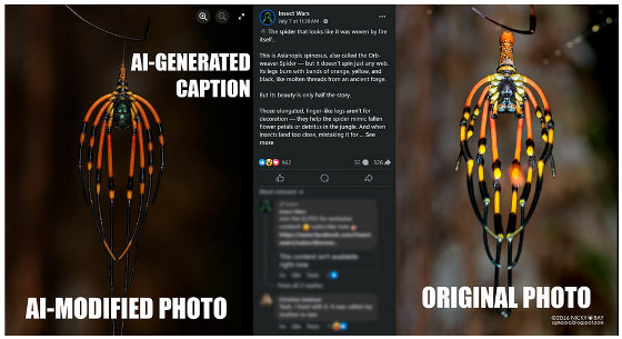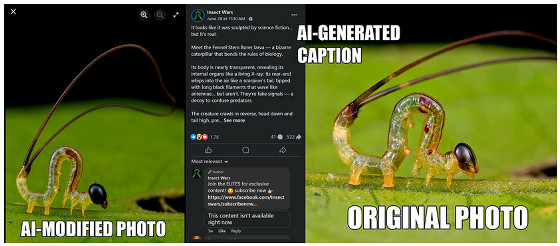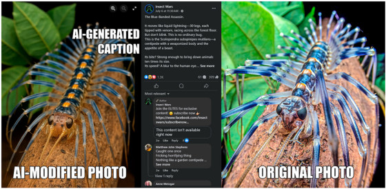 実際に生成AIユーザーが野生動物の写真を改変・再投稿した事例を示すため、ベイ氏は自身が撮影した写真と生成AIユーザーが再投稿した画像およびキャプションを並べ、複数紹介しています。ここから下にはさまざまな昆虫やムカデ、クモなどの写真を掲載しているため、苦手な人は注意して見てください。