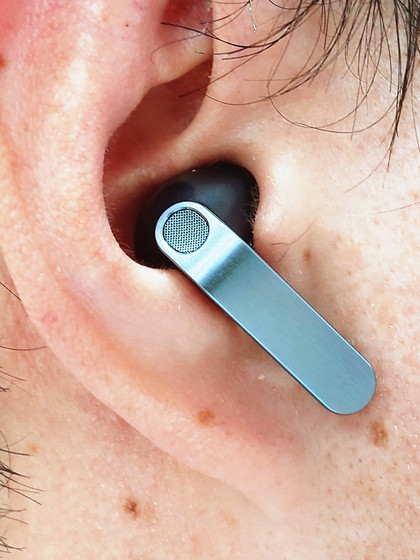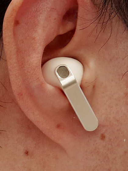Buds4 Pro装着時のイメージ。装着するとイヤーチップは完全に見えなくなるので、外観上の差異はマイク部分の微妙な形状の違いのみになります。