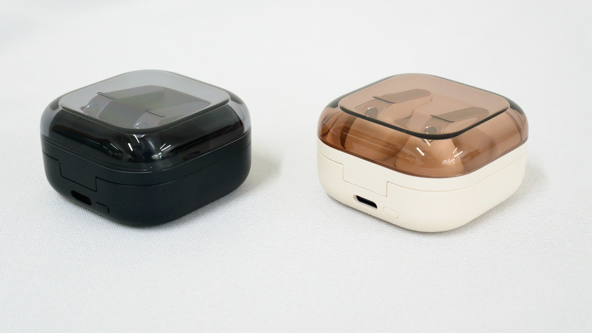 左が「Samsung Galaxy Buds4」のブラック、右が「Samsung Galaxy Buds4 Pro」のピンクゴールドです。ケースはいずれもフタ側がクリア素材になっていて、中のイヤホンが見えるようになっています。