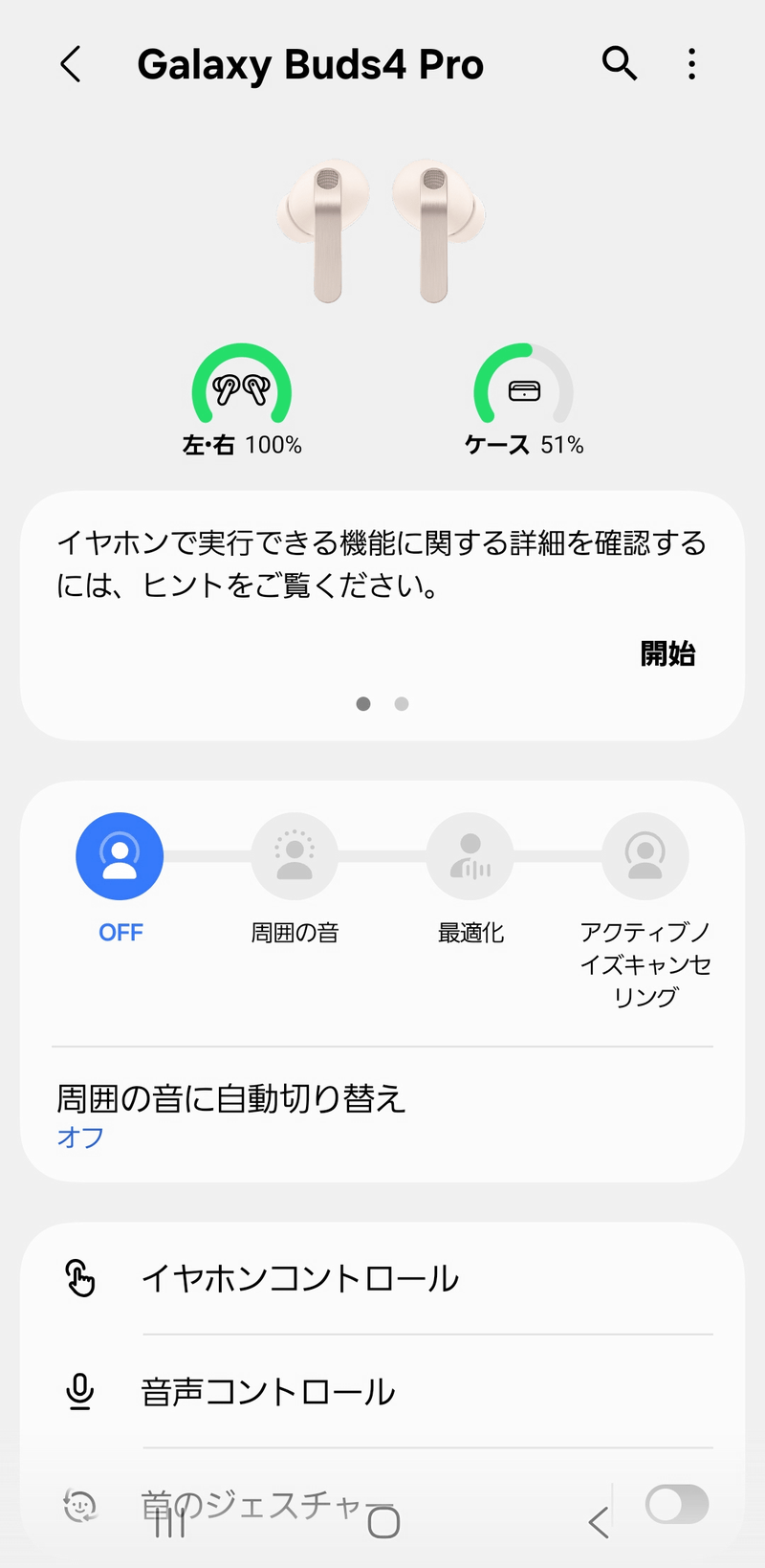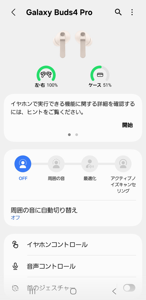 実際に使ってみたところ、Galaxy Buds4でも音質や使い勝手への文句は思いつかず、Buds4 Proはさらにイヤーチップによる密着感の高まりで使用感がアップして、総じて「いい……」以上の感想が出てこないぐらいの品でした。ノイズキャンセリング性能については、ほとんど問題ない印象ですが、人によっては「もうちょっと強くてもいい」という人もいるかもしれません。