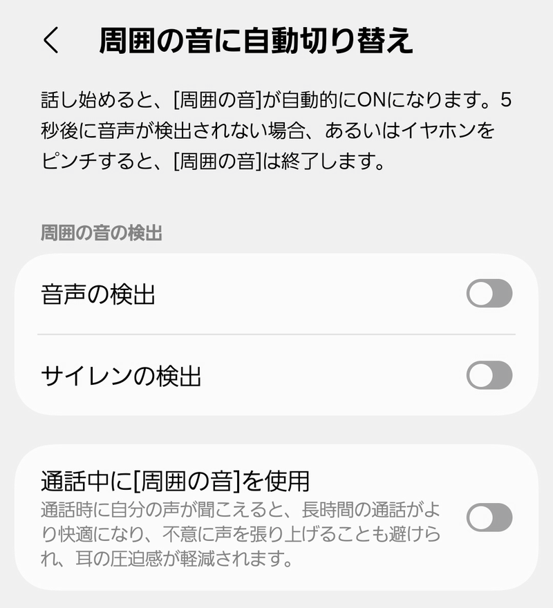 「周囲の音に自動切り替え」では、音声やサイレンの検出有無を切り替えられます。
