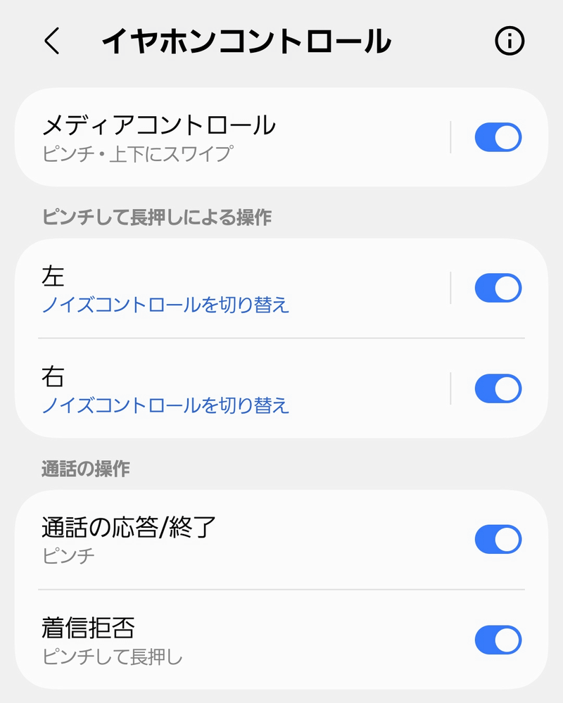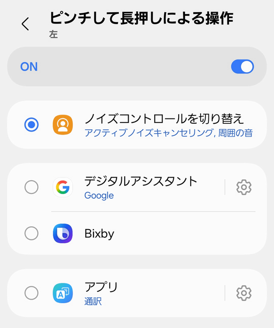 ピンチからの長押し操作は、デフォルトだとノイズコントロール切り替えになっていますが、AIアシスタント呼び出しや翻訳に変更することも可能。