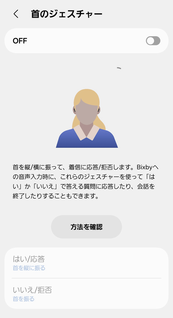 首を振って着信への応答・拒否をすることもできます。首振りジェスチャーのオンオフのほか、応答・拒否をそれぞれ「首を縦に振る」「横に振る」の好きな方に振り分け可能。