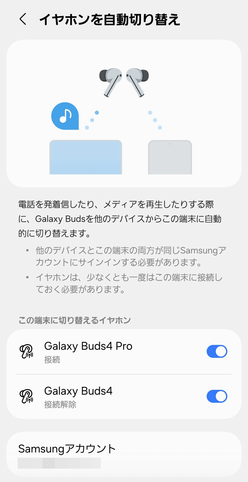 1つのイヤホンを複数端末とペアリングしている場合でも、端末でSamsungアカウントにログインしていれば、電話の発着信・メディア再生などのときに接続先を既定の端末に切り替えることができます。