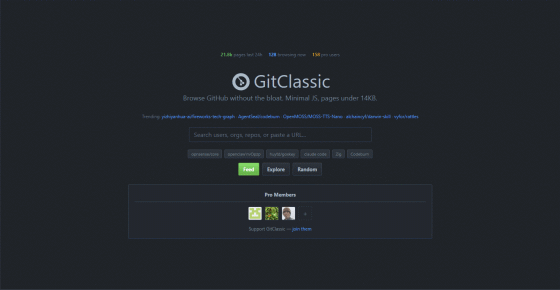 余計なものが一切ないGitHub風サービス「GitClassic」、JavaScriptの使用を最小限に抑えてファイルサイズはわずか14KB未満