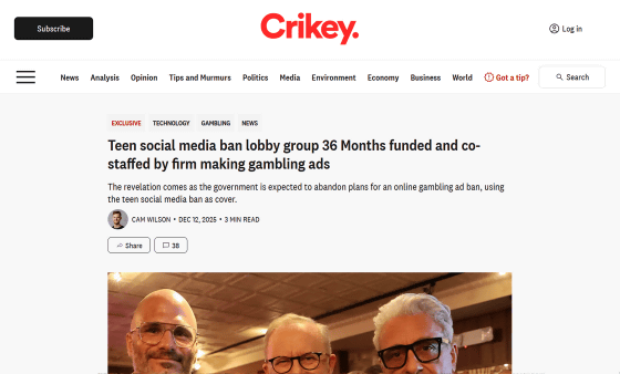 この法律はさまざまな議論を巻き起こしており、Redditは「憲法で定められた政治的言論の自由を侵害する」として高等裁判所に提訴しています。そんな中、オーストラリアのウェブメディアであるCrikeyが、「16歳未満のSNS利用を禁止する法律を推進するキャンペーンを運営していたのは、オンラインギャンブル広告を手がける広告代理店だった」と報じました。