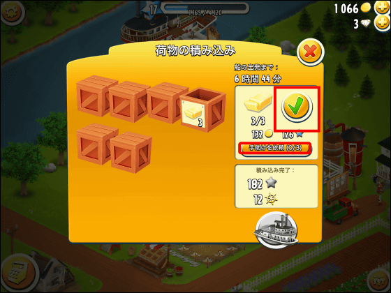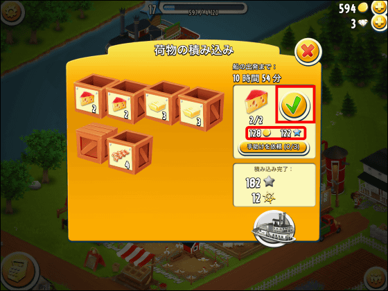 約1時間後、チーズを2個作成できたので、積み込みメニューから緑色のチェックをタップして船に積み込みます。チーズの下に記載されているのは、チーズの注文に対する報酬。船を使うと、それぞれの商品・全ての商品の積み込み時に報酬がもらえてお得感タップリというわけです。