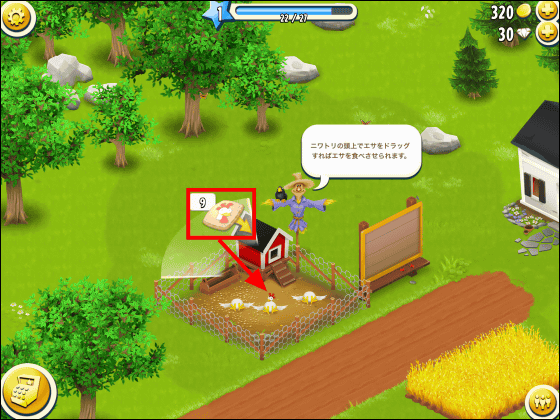 ヘイ・デイでは農作物を育てて収穫するだけでなく、家畜にエサをあげて畜産物を得ることもできます。ゲームプレイ時はニワトリのみ飼育可能。画面左下の「ショップ」をタップして「ニワトリ」を小屋にドラッグします。