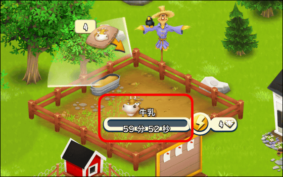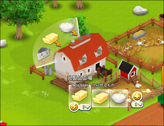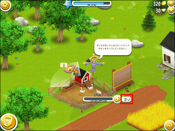 エサをあげるとニワトリが立ち上がってウロウロし始めました。ニワトリはタマゴを産んでくれるのですが、産むまでに20分かかります。今回は、ダイヤを使って生産時間を短縮。ダイヤはゲーム開始時に30個もらえますが、時間を短縮するために使いまくっていると、すぐに底をついてしまうので、無駄遣いには注意が必要です。