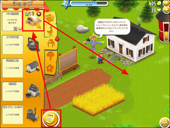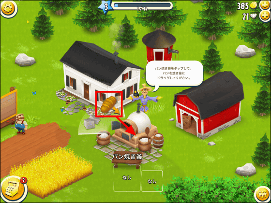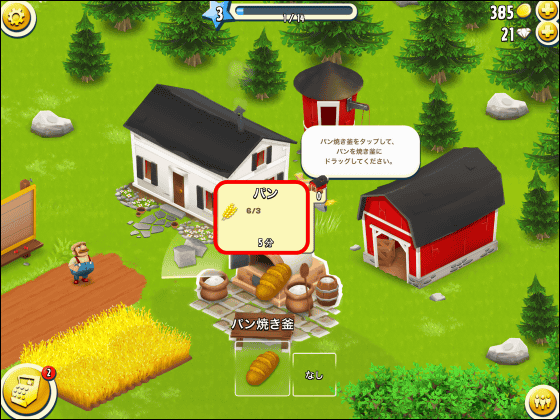 レベル2になると農作物や畜産物の加工施設「パン焼き釜」を設置可能になるので、ショップメニューからパン焼き釜を農場内にドラッグして、小麦からパンを作ってみます。