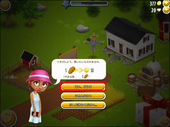 お客さんはパンを1個購入したいとのこと。パンは1個しかないのですが、初めてのお客さんということもあり、「はい、どうぞ」をタップして売却することにしました。商品を売却することで、レベルアップに必要なお金と経験値を得られます。