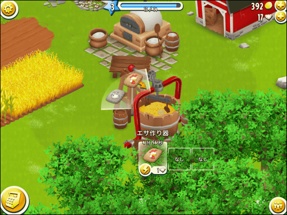 レベル3になると、加工施設だけではなく家畜のエサ作り器も設置可能になります。下記画像では小麦2つとトウモロコシ1つでニワトリのエサを作成中。つまり、「農作物を育てる→収穫して家畜のエサにする→家畜から畜産物を作る」というのが基本の流れとなります。
