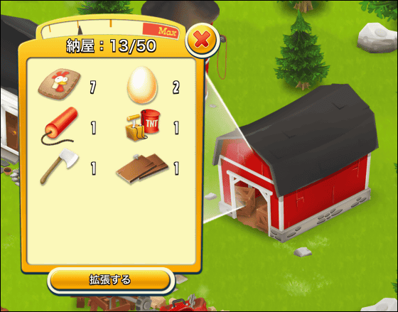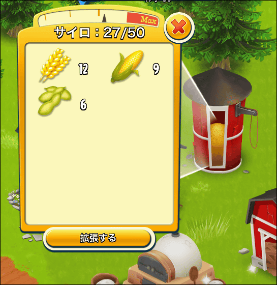 また、収穫した農作物はサイロに保管されていきます。ゲーム開始時の保管限度数は「50」に設定されていますが、保管限度数に達した場合にはダイヤを使って拡張が可能。
