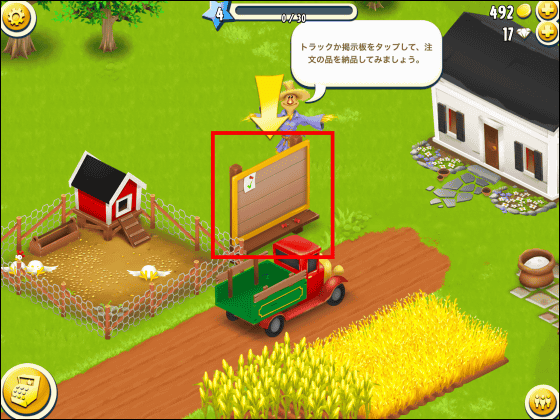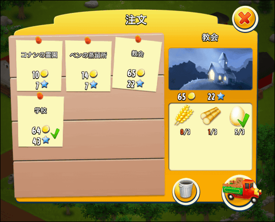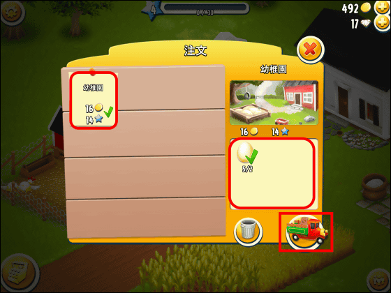 注文は幼稚園からの1件のみ。左側にある注文カードに報酬が、右側に注文内容が書かれています。注文内容はタマゴ2個。タマゴを5個所持しているので納品することにし、掲示板の右下にあるトラックをタップします。