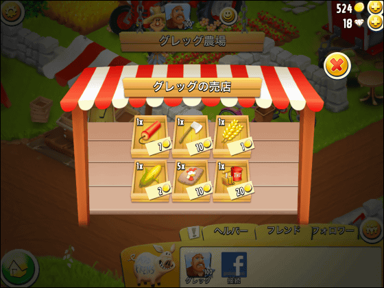 グレッグさんの農場は、自分の農場とは比べものにならないくらい豪華。とりあえずはウィッカーさんの言う通り、売店をタップして売り物をチェックします。