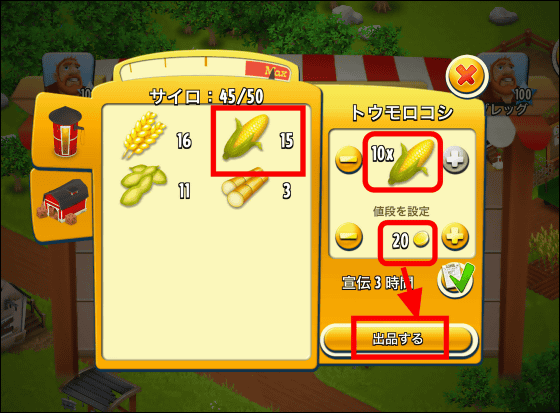 売る商品・個数・値段を設定し「出品する」をタップすると、商品の出品は完了。ここまでをおさらいすると、訪問客・注文の納品・売店の3つが、商品を売却する方法になります。この3つをバランスよく活用して、お金や経験値を稼いでレベルを上げて農場を大きくしていくというわけ。