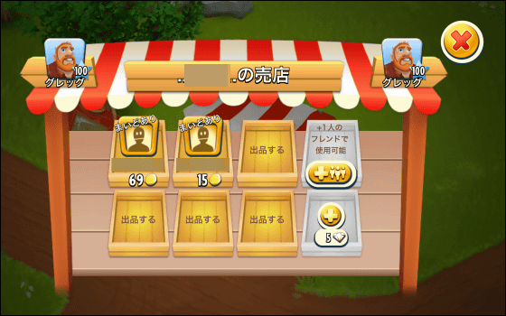 こちらが他のユーザーの売店ですが、資金に余裕がないので今回は見送ることに。右上の「×」をタップして売店を閉じます。