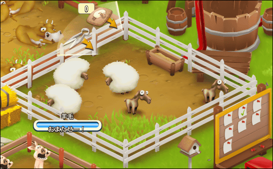 ニワトリの下に「おまたせー!」と表示されたら、タマゴの回収準備はOK。小屋をタップして表示される「カゴ」をニワトリにドラッグします。