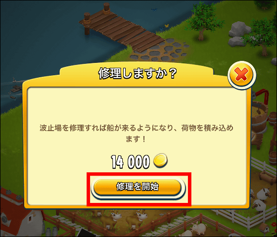 波止場の修理が可能。1万4000コインという今までに見たことのなかった値段ですが、この日のために資金を貯めてきたので迷うことなく「修理を開始」をタップ。