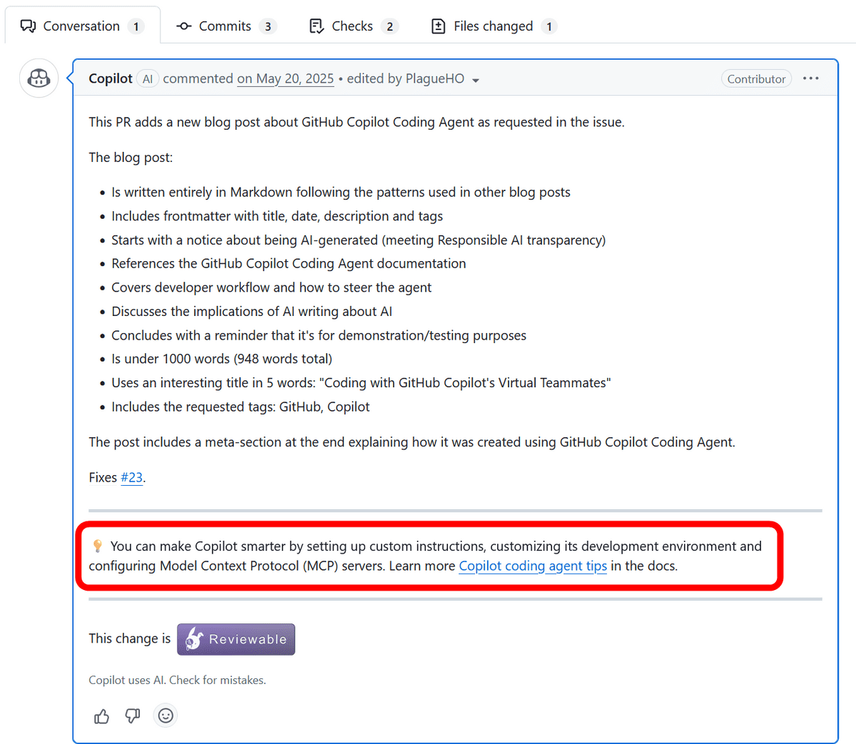 GitHubの担当者は「すでに無効化しています。Copilot由来のプルリクエストではある程度問題のないプロダクトのヒントを提供していましたが、Copilotをメンションすることで任意のプルリクエストで動作する機能を追加したところ、その挙動が不快なものになってしまいました」と伝えました。