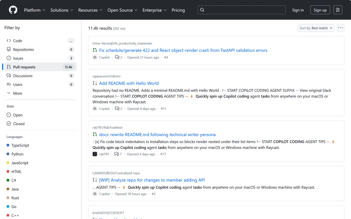 「"⚡ Quickly spin up copilot coding tasks"」というワードで検索すると、Copilotが書いた「Raycastを使用すると、macOSまたはWindowsマシン上のどこからでもCopilotコーディングエージェントタスクをすばやく起動できます」という文章が山ほど表示されるという指摘もあります。