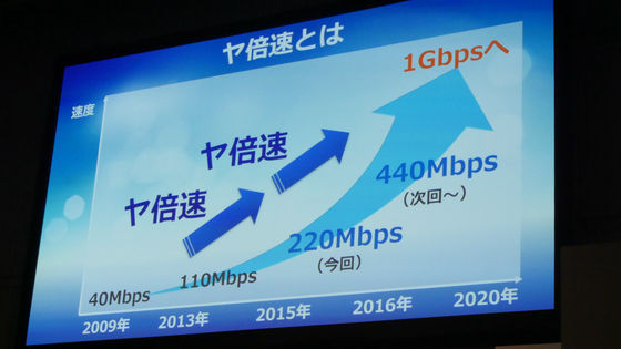 ギガヤバ革命の柱となる「ヤ倍速」とは、UQが実現していく通信速度高速化の総称。キャリアアグリゲーションや世界初の4×4MIMO(フォーバイフォーマイモ)技術を導入することにより、WiMAX 2+の下り最大速度を110Mbpsから220Mbpsへ2倍化し「ヤ倍速」を実現するというわけ。また、キャリアアグリゲーションと4×4MIMOを組み合わせることで、将来的には220Mbpsからさらに440Mbpsという超高速通信速度の実現を目指しています。