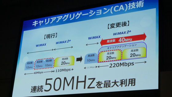 ヤ倍速を実現する技術の1つはキャリアアグリゲーション。WiMAX2+への周波数割り当てを増やすことで、下り最大220Mbpsという高速通信を可能にします。