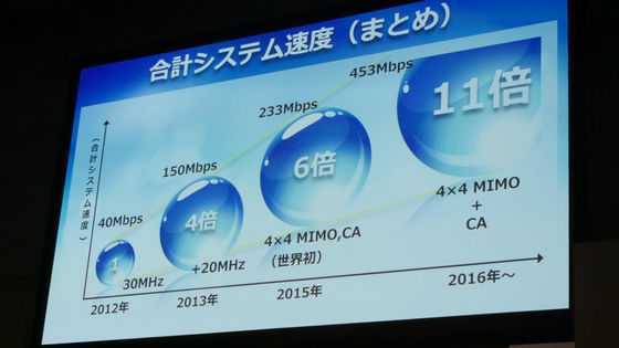 220Mbpsを実現する「キャリアアグリゲーション」と「4×4MIMO」の2つの技術を組み併せ、将来的には爆速の440Mbpsが可能に。2020年までの東京オリンピックには下り最大1Gbpsを目指していきます。