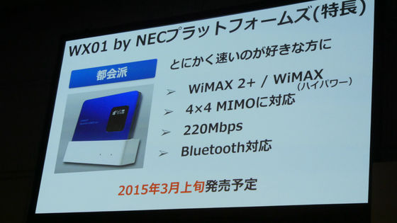 WX01はNECプラットフォーム製。4×4MIMO技術で220Mbpsを実現しWiMAX2+とWiMAXの両方に対応。発売は2015年3月上旬に予定されています。