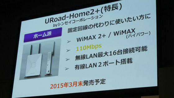 さらに、固定回線替わりに使いたいユーザー向けに据え置き型のシンセイコーポレーション製「Uroad-Home2+」もリリース。Uroad-Home2+はWiMAXとWiMAX 2+の両方に対応しており、速度は110Mbps。無線LANは最大16台接続可能で、有線LAN2ポート搭載しており、2015年3月末発売予定です。