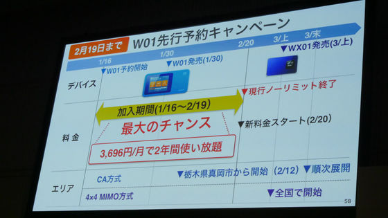 キャリアアグリゲーションのヤ倍速に対応している「W01」は1月16日から2月19日まで先行予約キャンペーンを実施。キャンペーン期間内に加入すれば月額3696円で2年間ヤ倍速を使い放題です。