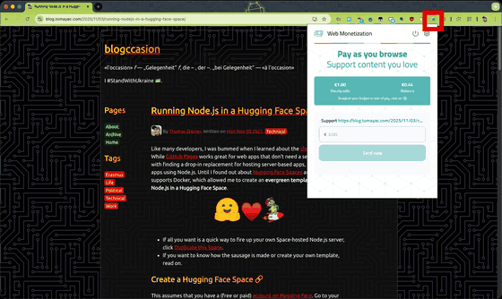 シュタイナー氏はJSConf MexicoでInterledger FoundationのメンバーとWeb Monetizationについて議論したことをきっかけに、この技術を試してみたとのこと。