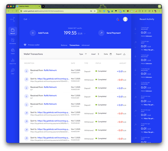 シュタイナー氏が自分のブログを閲覧したところ、自身のGateHubウォレットから支払いが送信され、自身のウォレットで受信した記録が確認できました。任意の金額を1回だけ送金することも成功したとのこと。