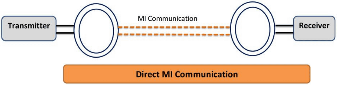 従来のMI無線通信アーキテクチャでは、相互磁気誘導の基本原理を利用したコイルを使用して通信信号が送受信されます。送信コイルは正弦波電流の形で信号を送信し、それが受信ノード内部に別の同様の正弦波電流を誘導し、通信が実現します。送信コイルと受信コイル間の相互作用は相互誘導によるものです。この仕組みは電気の変圧器に近く、空間に電波を飛ばすのではなく、近距離の磁場の結合を利用して信号を伝えるのが特徴です。しかし、このようなMI無線通信技術では、安定した通信チャネルやコイルの小型化といった利点がある一方で、通信範囲が狭かったり伝送距離が長い場合のパス損失が大きかったりと、技術的限界もありました。