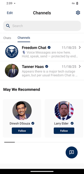 しかし、Conversoは「Freedom Chat」と名前を変えて、再び配信されました。実は、Conversoのユーザー層はアメリカ保守層に偏っていたそうで、リブランドにあわせて明確にアプリのターゲットを保守層に絞った模様。たとえば、スクリーンショット防止機能について「保守派のスクリーンショットに対する複雑な事情」に配慮したものだと説明されていたり、おすすめユーザーとして保守派のインフルエンサーが表示されたりします。
