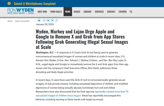 新たに、アメリカのロン・ワイデン上院議員、エド・マーキー上院議員、ベン・レイシャル上院議員が、Appleのティム・クックCEOとGoogleのサンダー・ピチャイCEO宛に公開書簡を送付しました。公開書簡には、「Appleはイーロン・マスクCEOが不穏でおそらく違法な活動に対処するまで、XアプリとGrokアプリを自社のアプリストアから直ちに削除すべき」と記されています。